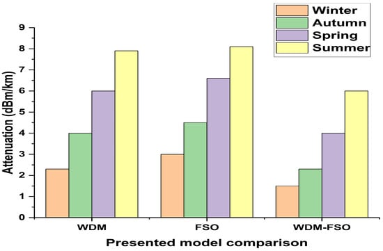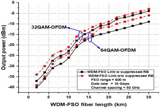 The presented hybrid WDM-FSO link is modeled and discussed mathematically in previous sections. This section includes the results analysis of the simulation framework based on weather conditions, attenuation, RB losses, received power, FSO range, and fiber length. Figure 3 mentions the consequences of simulation setup for different weather conditions like summer, spring, autumn, and winter as a function of attenuation. The analysis of the presented model is also compared in Figure 3 with conventional WDM and FSO structures. Two types of estimations are described in Figure 3, wherein the first type explains that the attenuation of the WDM, FSO, and WDM-FSO links varies according to weather statuses. Like in summer, by reason of high temperature, the attenuation rate is maximum as equated to winter, autumn, and spring. To equate the attenuation rate of the presented WDM-FSO link against the standard WDM framework for summer, the WDM-FSO link is 3dBm less attenuated than standard WDM technology. The investigation of the Q-factor against various weather statuses (clear, drizzle, rainy, storm, and fogy) is measured in Figure 4 for the presented WDM-FSO link using modern modulation schemes. It is seen from Figure 4 that the WDM-FSO link with 64QAM-OFDM generated 5G NR-SubTHz signals gives an acceptable Q-factor even in bad weather conditions. On the other side, the performance of the WDM-FSO link is degraded at fogy and storm weather statuses using 8, 16, 32, and 63 QAM-OFDM modulation structures. It is also evaluated from the results that the ratio of RB generation increases with rainy, foggy, and storm weather statuses. The investigations of RB suppressed outcomes, and RB included WDM-FSO link outcomes are analyzed in Figure 5. These outcomes are evaluated in terms of Q-factor and transmission length. Figure 5 also compares the achievements of WDM-FSO link transmitting 32 and 64QAM-OFDM based 5G NR-subTHz signals with 600 FSO length and 10 Gbps data rate speed. It is investigated that the Q-factor of the output signal decreases with increasing transmission path of SMF. Furthermore, it is noted that RB suppressed based WDM-FSO link gives the output data with satisfactory Q-factor. Next, it is clarified from Figure 5 that achieving the WDM-FSO system enhances by applying a high modulation format (64QAM-OFDM). Figure 6 describes the output power in terms of SMF range simulation analysis at 50 GHz channel spacing, 600 m FSO range, and 10 Gbps data rate speed. These outcomes are then compared among suppressed RB based signals, and RB included signals. The relation between 64QAM-OFDM and 32QAM-OFDM propagated channels is also discussed in Figure 6. This explains that the desired pulses are attained at the receiver side with less power consumption by installing the 64QAM-OFDM based transmitter. Secondly, it is studied that the propagated channels with suppressed RB consumed less power in matching with RB added channels.