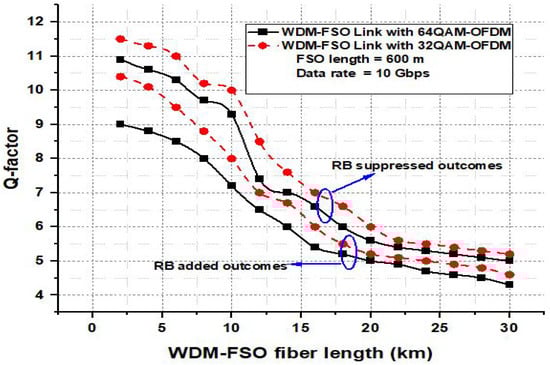 Fiber length estimations against Q-factor for matching the outcomes of suppressed RB based WDM-FSO and without suppressed RB based WDM FSO link.