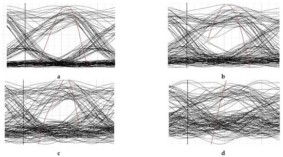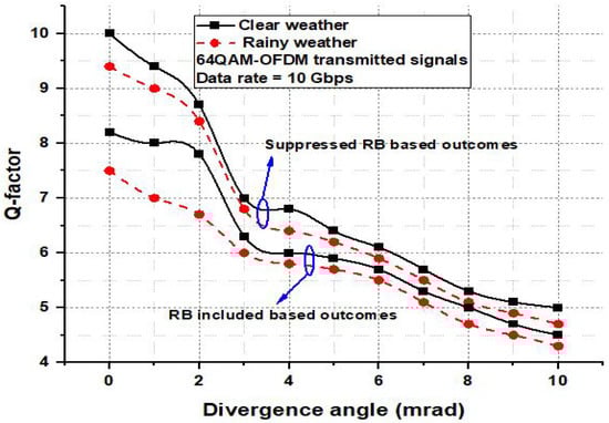 The analysis of various divergence angles as a function of the Q-factor is estimated in Figure 7. This figure also matches the outlets of 64QAM-OFDM based WDM-FSO link across rainy and clear weather statuses and suppressed RB based outcomes and without RB suppressed outcomes. From investigations, it is found that there is a clear difference among the products of the WDM-FSO link in clear and rainy weather statuses. However, it is evaluated that the presented model with suppressed RB channel has efficient outcomes in both rainy and precise weather conditions. Estimating the divergence angle, it is declared that system performances are degraded with increasing divergence angle. Figure 8 contains the proposed model measurements in eye diagrams. Where Figure 8a declares the eye diagram of suppressed RB based WDM-FSO link with 64QAM-OFDM generated 5G NR-SubTHz channel in clear weather. Figure 8b includes the outcomes of suppressed RB enabled WDM-FSO link with 64QAM-OFDM generated 5G NR-SubTHz signals in rainy weather. Similarly, the outputs of proposed without suppressed RB based WDM-FSO in clear and rainy weather statuses are presented in Figure 8c,d, respectively. In final step of results and discussion the proposed model products are compared with current models as depicted in Table 2, which shows that the presented has better outcomes as correlated to current frameworks.