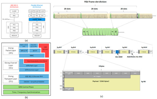 (a) The fundamental architecture of FlexE. (b) The SPN architecture that supports fine-granularity technology. (c) The FGU frame structure of FlexE N×10 Mbps.