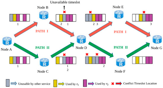 Let us take a look at a simple example where there is a service that needs to occupy one timeslot and a service that needs to occupy two timeslots. Both of them need to establish an end-to-end connection from Node A to Node G. At this time, we assume that there are two paths, Path I and Path II, available for routing, and the timeslots marked in gray cannot be used because they have occupied by other services. Through the pre-allocation of timeslot resources and the dispatching of the conflicting timeslot, the timeslot positions occupied by the service slices on different routes are shown in Figure 2.
