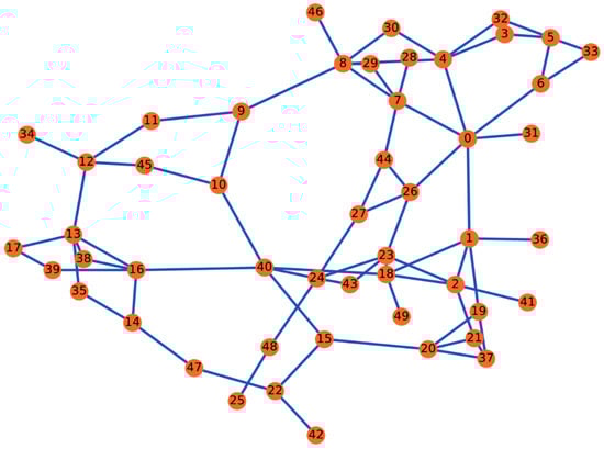 Real power communication network topology of a city—50 nodes, 75 bidirectional fiber links.