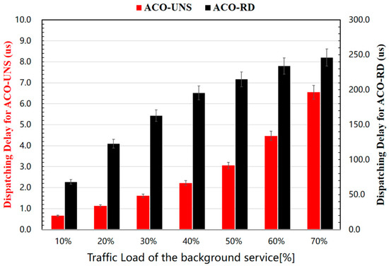 We first placed a service with a fixed bandwidth in the topology and calculated the service route and end-to-end dispatching delay by the ACO-UNS algorithm we proposed with multiple sets of timeslot-occupied cases by different loads, respectively, and the ACO-RD calculates the end-to-end scheduling delay by using a random allocation method for the timeslots of each link in the routing calculated by the ACO-UNS algorithm we proposed. Finally, we compared the data results and performed an analysis.