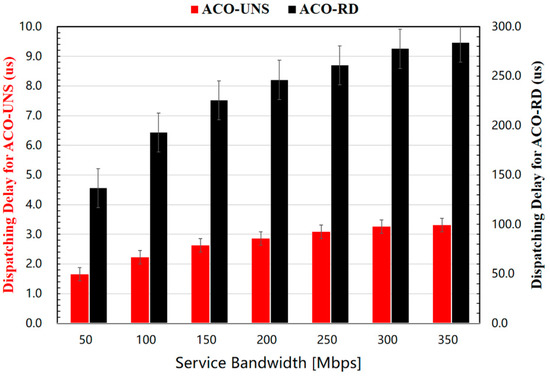 Figure 7 shows the comparison results of the end-to-end dispatching delay between the two timeslot allocation and dispatching schemes of the ACO-UNS and the ACO-RD for services with different bandwidths under the same network load and the routing hops, respectively. This is because the timeslots to be allocated and dispatched will increase with the increase in the service bandwidth, which causes the decrease in the available timeslots in feasible solutions space for each timeslot according to the unidirectional neighborhood search mechanism; therefore, the probability of the timeslot conflict and the end-to-end dispatching delay of the service will increase under the same load.