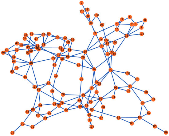 The routing hops are the number of relay routes that pass from the source node to the destination node, and in this section, we randomly select a sufficient number of services such that all services have 1 to 11 routing hops in the IEEE Power Bus–System communication network topology with 118 nodes, as shown in Figure 8. Then, we set the network load to 40% for each communication node in the network, and to exclude the chance of experimental results, we randomly generate the timeslot occupancy cases of multiple groups of background services and calculate the end-to-end dispatching delay based on the ACO-UNS we proposed in the paper.