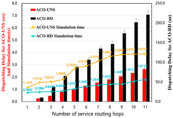 Meanwhile, we apply the ACO-RD algorithm to allocate and dispatch the positions of the conflicting timeslot in each link and calculate the end-to-end dispatching delay; in addition, we also compare the simulation time with the ACO-UNS algorithms results, and other simulation parameters are set the same as in simulation (a).
