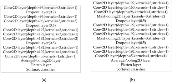 The significance of the CV-QKD attack detection models in our work can be mainly described in following two points. First of all, to conduct a one-pixel attack, we require numerous well-trained models as the scoring function. Second, the output labels of the models are the main metric to measure the effectiveness of our attack. According to the research of Jiawei Su et al. [29], which is the first to propose the one-pixel attack in the image field, this attack algorithm is effective in many deep neural networks, such as the all convolution network (AllConv), Network in Network (NiN) [31], Visual Geometry Group Network (VGG16) [32], and AlexNet. In our work, we select two classical models, AllConv and NiN, and additionally append two kinds of widely used DNNs, ResNet [33], and DenseNet [34] to validate our attack effect. The model training and attack simulation are programmed in Python with the help of its provided packages and some fundamental open source code; the dataset is generated in Matlab R2019b. The detailed structures of the AllConv and NiN network can be seen in Figure 2a,b, while the rest of the information is presented in Appendix B. Since the input matrix is relatively simpler than the initially designed input of the image information for the models, we predigest the structures slightly. Note that some dropout layers are added to our models compared with the original. We make these modifications in order to achieve a higher classification accuracy, which is proven to be effective by our tests. The standardized method is also used in data preprocessing in our work. In this way, the huge discrepancy between the measuring units of the different features can be mapped to a comparable range.