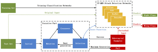 For a CV-QKD attacks detection network, the structure is generally designed as a DNN, which guarantees the feasibility of launching a one-pixel attack. Considering the compatibility, we rebuild the one-pixel attack on the basis of its original approach and DE algorithm. The frame of our attacking method is shown in Figure 4. The blue blocks in the frame are the four main parts of DE, which are used to find the most influential point to the classification result among an input matrix.