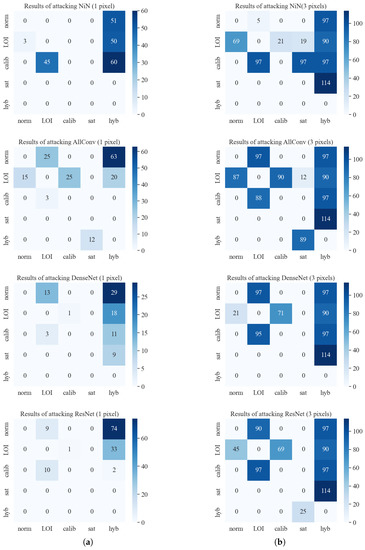 Figures above show the attack efficiency of perturbing 1 pixel and 3 pixels under 2000 times non-target attacks in the same dataset. The darker color shades represent the greater number of success attacks. (a) The result of target attacks by perturbing 1 pixel of an input matrix for each network. (b) The result of target attacks by perturbing 3 pixels of an input matrix for each network. AllConv: all convolution network. NiN: Network in Network. Norm: the unattacked state. LOI: LO intensity attacks. Calib: calibration attacks. Sat: saturation attacks. Hyb: the hybrids attacks.