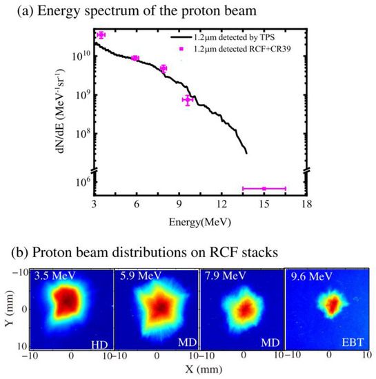In the experiment, a p-polarized laser pulse with 1.8 J of energy and 30 fs duration was focused onto a 1.2 μm thickness plastic target by using a f/3.5 off-axis parabola at an incident angle of 30 degrees with respect to the target’s normal direction. The on-target intensity was 8 × 1019 W/cm2. The laser contrast was 10−10 at 40 ps before the main pulse, which was achieved by using a cross-polarized wave generation (XPW). The high energy protons were mainly generated by the target normal sheath acceleration (TNSA) mechanism [15,24]. In the TNSA, the hot electrons are driven out of the solid density target due to the ponderomotive force of the laser, forming a sheath field with a gradient of up to TV/m. The ions (mainly protons with the highest charge-to-mass ratio) on the surfaces of the target are accelerated accordingly to high energy within tens of micrometers. Due to the ultra-short transient acceleration process, the proton beam has the characteristics of a high short pulse duration (ps-ns), a high peak current, a large divergence angle (tens of degrees), and an exponential decay energy spectrum.