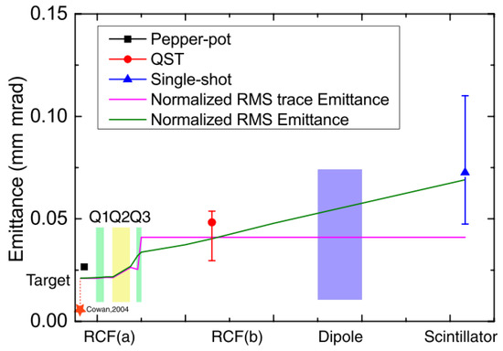 Figure 4 summarizes the emittance measurements for the 5 MeV laser-accelerated proton beam, which was measured at three different positions with the above three methods. The solid curves are the evolution of the emittance, as simulated with the program CST, in which protons with a source size of 50 μm, an energy spread of ±2%, and a divergence of ± 20 mrad were simulated, corresponding to an original emittance . Here, is the normalized root mean square (rms) emittance that was derived in the trace space (x; x′) and is the rms emittance that was derived in the phase space (x; px) [31]. There is clear growth in , both inside of the triplet and in the drift space, which matches the simulation well. The symbols with error bars are the experiment result. We have shown that the initial extremely small emittance at the source point (less than 0.004 mm mrad, as measured by Cowan [32]) increases by more than one order of magnitude after a few centimeters of propagation and remains between 0.04 mm mrad and 0.10 m mrad for the subsequent transport. This conclusion is suitable for the measured protons with ±2% energy spread and ±20 mrad angle in order to meet with the paraxial condition, which means that for the design of a monoenergetic beamline, the laser accelerator can be regarded as the same as the conventional accelerator. However, in order to fully use the laser-accelerated protons, an achromatic beamline with a large acceptance angle is recommended. In this condition, the emittance will increase significantly under the double effects of energy chromatic aberrations and the nonlinear edge field of the magnet components, bringing great challenge to the beamline design.