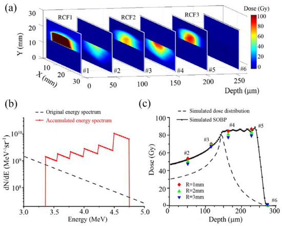 Figure 5c shows the calculated dose distribution (the black solid curve) at different depths and the experimental average doses within 1 mm (the red diamond), 2 mm (the green triangle), and 3 mm (the blue triangle) radius of the beam spots. The results show a good fit to the expected depth profile, demonstrating that it is possible to produce a SOBP with a laser accelerator. The black dashed curve in Figure 5c shows the expected dose curve if we were to use the original exponentially decaying spectrum directly (the dashed curve in Figure 5a), for comparison. Hence, tailoring the number of shots for different central energies changes the final dose depth profile, and enables an initially exponentially decaying spectrum in order to satisfy the requirements of the SOBP. The result also shows the potential feasibility of future irradiation based on laser-accelerated proton beams.