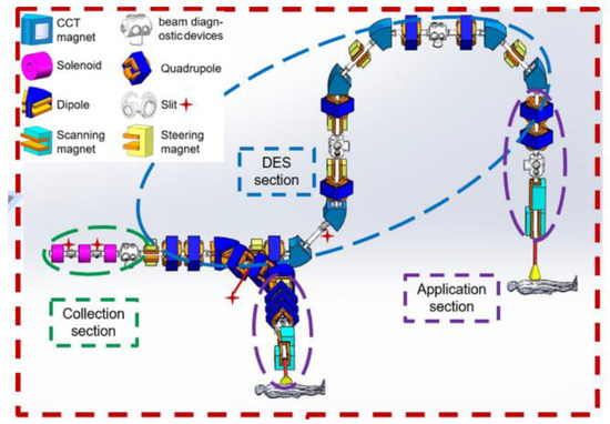 The CLAPA II beam transmission system is designed for a 100 MeV proton beam that is produced by PW laser acceleration, and its feasibility is tested through theoretical simulations [46]. It is designed with two transport lines in order to provide both horizontal and vertical irradiation modes, as demonstrated in Figure 6. The length and the bending angle of the horizontal beamline are 12.96 m and 90°, respectively, and for the vertical beamline these values are 22.56 m and 270°, respectively. Compared to the original CLAPA beamline, the new design includes magnets with multiple functions and has several notable advantages, including an improved acceptance angle, achromatic ability, and a better spot uniformity. A locally-achromatic design method with new canted-cosine-theta (CCT) magnets [47] has been used to mitigate the negative effects of the large energy spread that is produced by laser acceleration, and to reduce the overall weight of the vertical beamline. The beamline contains a complete energy selection system, which can reduce the energy spread of the laser-accelerated beam enough to meet the application requirements. The users can select the proton beam energy within the range of 40–100 MeV, which is then transmitted through the rest of the beamline. A beam spot with a diameter of less than 15 mm and an energy spread of less than 5% can be provided at the horizontal and vertical irradiation targets. Each bending element of the beamline is locally achromatic, which allows us to significantly limit the envelope growth of the beam, due to dispersion. The use of CCT magnet technology in the vertical beamline can provide design experience for follow-up work with a superconducting gantry. CLAPA II and the beamline is expected to be operational in the Beijing Laser Accelerator Innovation Center (BLAIC) in 2024.