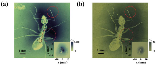 Figure 8 shows the images of the ant that were recorded on (a) the HD-V2 RCF and (b) the EBT3 RCF, where the dark areas are irradiated by the proton spots. The small graphs that are inserted into the lower right corner are the entirety of the radiography images. Since the ants block a part of the low-energy protons, their shapes and their internal structures are imprinted by the color changing on the background of the proton beam spots. In the magnified images of the center big ant, both the external structure and the internal organs can be distinguished with a micrometer spatial resolution. Comparing Figure 8a,b, we find that the protons of different energies can clearly distinguish the different structures of the ants. For example, the antennae of the ant (marked by the solid red line in the figure) can be better distinguished on the HD-V2 RCF with the 2.9 MeV protons, while the tibia of the ant (marked by the red dashed line) is much clearer on the EBT3 RCF with the 5.6 MeV protons. It provides a feasible method that uses the laser-accelerated proton beam with a broad energy spectrum to analyze the structure of different depths inside the irradiated object by one single shot.