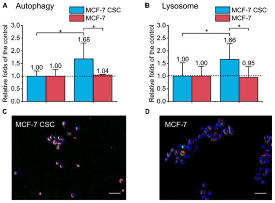 Detection of autophagy and lysosomes in the irradiated MCF-7 cells and MCF-7 CSCs. (A) Compared with the control, the increase in the autophagy proportion of the irradiated group. (B) Compared with the control, the increase in lysosomes of the irradiated group. All results are expressed as means ± SD, Student’s t-test or one-way ANOVA are used for analyzing significance between the controls and the experimental groups, where p < 0.05 was marked as *. (C,D) Representative images of irradiated MCF-7 cells and MCF-7 CSCs stained with MDC autophagy detection kit and lysoTracker Red DND-99. The blue is the nucleus, the red is the lysosome, and the green is labeled autophagy.