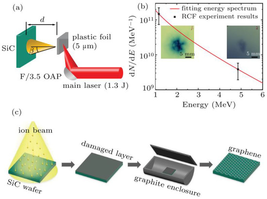 - Zhou, D.; Li, D.; Chen, Y.; Wu, M.; Yang, T.; Cheng, H.; Li, Y.; Chen, Y.; Li, Y.; Geng, Y.; et al. Preparation of graphene on SiC by laser-accelerated pulsed ion beams. Chin. Phys. B 2021, 30, 116106. [Google Scholar] [CrossRef]