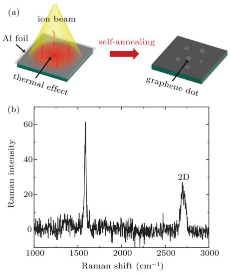 We carried out a control experiment using the continuous mono-energy protons from a traditional accelerator with the same beam fluence. We found that no graphene was generated under this condition. Although the laser-accelerated ion beams maintained a small radiation dose, the thermal effect that was caused by the continuous small interval bombardment of the instantaneous pulse beam caused more serious damage to the sample surface than the traditional ion accelerator. Apart from this, in consideration of the thermal effect that was caused by the large instantaneous beam current, the self-annealing had a certain effect on the graphene under a closer irradiation distance, as demonstrated in Figure 13a. We shortened the irradiation distance to 1 cm. Figure 13b is the Raman spectrum of the sample that was measured after it was irradiated by 100-shots. Graphene of a high quality was synthesized without annealing, and the very small D peak showed the high quality of that graphene dot.