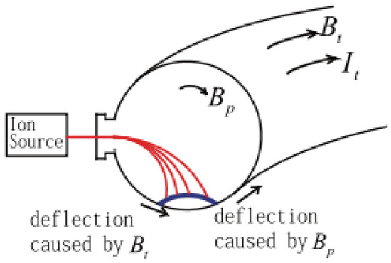 When an ion enters into a magnetic confinement fusion device, for example, a tokamak, its orbit will be changed by the electromagnetic field. Based on that, a new method was proposed to diagnose the profiles of both the poloidal magnetic field (Bρ) and the radial electric field (Er), which consists of a laser ion beam (LIB) and a detector with high temporal and spatial resolution, and was named as Laser-accelerated Ion-beam Trace Probe (LITP) [77]. The principle of the LITP is shown in Figure 14. The broad energy spread and the large divergence of the LIB makes its traces almost cover the whole core plasma area, which gives the LITP more capabilities, such as obtaining the 2D Bp profile or the 1D profile of both the poloidal and the radial magnetic fields at the same time [77,78], as well as the 2D electron density profile [79]. Furthermore, the LITP can be used in superconductive tokamaks, such as EAST, KSTAR, ITER, etc., because only a small window is needed to inject a laser pulse. By improving the nonlinear reconstruction method, the LITP could be applied not only in tokamak devices, but also in other toroidal devices, such as the spherical tokamak [80], reversal field pinch (RFP), etc.