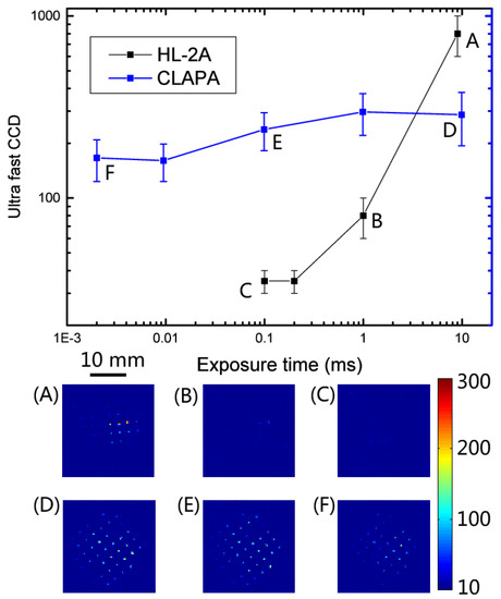 As a new diagnostic method of the core electromagnetic field, the LITP is expected to realize the first application of the advanced laser accelerator in magnetic confinement fusion. We have designed and verified the feasibility of the LITP ion detection through systemic experiments [81]. A CsI(Tl) scintillator that was coupled with an imaging system that was composed of an optical lens and an optical fiber array for LITP was designed and tested on the HL-2A tokamak device in the Southwestern Institute of Physics. The scintillator detector was set at 100 mm to the edge of the plasma and the temperature at its location was about 110 °C–340 °C. The detector was sent into the plasma region using a long-range stepper motor translation linear stage. The signal light from the scintillator was transported by a well-shielded image system and recorded with an ultrafast CCD. The CsI scintillator was not damaged by the harsh environment after being placed in the tokamak for three days, and the real background noise that was caused by the hot plasma electrons and the radiation was measured. We found that the background noise was completely suppressed when using an ultrafast camera and a microsecond shutter. The black curve in Figure 15, which is the intensity of the background signal caused by soft X-rays in the HL-2A tokamak, decreases rapidly (from 1000 to 10) as the shutter time decreases (from 10 ms to 0.1 ms). The corresponding CCD images at the exposure times of A (10 ms), B (1 ms), and C (0.1 ms) are illustrated below. When the exposure time was shorter than 0.2 ms, the background signal was reduced to the same level as the dark noise of the CCD.