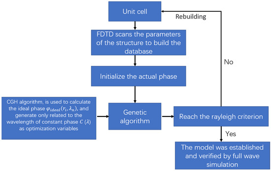 The phase shift of our designed metasurface, which consists of a properly arranged cylindrical dielectric nanopillar structure with rotational symmetry, depends on the propagation phase with the polarization-independent property. Therefore, to match the calculated ideal phase, we need to build a phase library of the nanopillar. Finite-difference time domain (FDTD) simulations are performed to acquire phase shifts of nanopillars for 2 nm increment of each geometric parameter by using the commercial software package “FDTD Solutions” (Lumerical Inc., Vancouver, BC, Canada). Periodic boundary conditions are applied along the x and y axes, and the perfectly matched layers (PMLs) are applied in the z direction. The sweeping scope of lengths’ diameter of the nanopillars covers 80 nm to 310 nm with fixed height H = 600 nm, while the properly arranged array of nanopillars has a lattice constant of Px = Py = 320 nm. It can be seen from Figure 2a that when the period p = 320 nm, the obtained propagation phase library can cover the phase distribution of and meet our requirements for phase matching. The specific optimization process is shown in Figure 3.