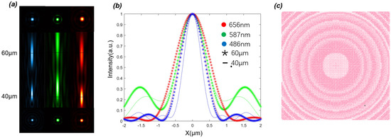 The right part of Figure 4a–c represents the gds layout of the metalens structure. The simulation results of corresponding wavelengths are shown on the left. The three wavelengths are blue (486 nm), green (587 nm), and red (656 nm), respectively, which vividly show the longitudinal and transverse intensity distributions.