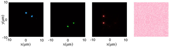 We designed a metasurface with a diameter of 32 μm × 32 μm and a focal length of 10 μm. The focusing field results of B, G, and R wavelengths are obtained by full-wave simulation software. It can be seen from Figure 6 that the position arrangement of the focal spot is almost the same as the theoretical design (4 microns from the origin, hexagonal distribution), the maximum position error is only about 0.31 λ, and the stray light is small and the energy is concentrated.