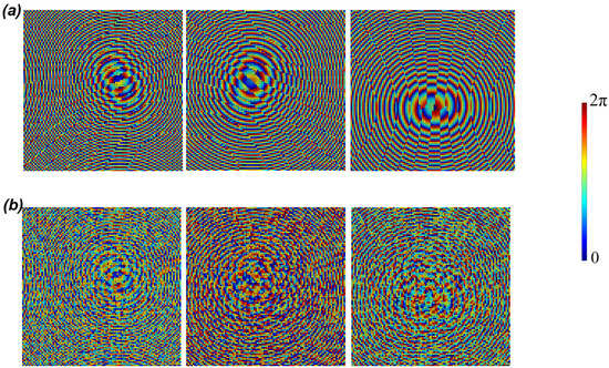 (a) From left to right, the ideal phase distributions corresponding to the three wavelengths B, G, and R, respectively, are shown; (b) From left to right, the real phase distributions corresponding to the three wavelengths B, G, and R, respectively, are shown.
