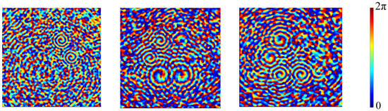 It can be seen from Figure 8 and Figure 9 that under the illumination of light waves of different wavelengths, different vortex arrays are emitted from the metasurface, and the topological charge of the vortex array is 1. The simulation results are consistent with the theoretical design. However, this design cannot always produce good results. When the number of light spots generated is too large, especially when there are different patterns of light spots mixed together, the energy distribution of the light spots may be uneven, and there may be other diffraction spots.