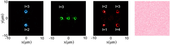 In the fields of communication, control of microscopic particles, and superresolution imaging, vortex beams are of undoubted importance. The array form of the vortex beam is more helpful to improve its efficiency and freedom. In this section, we still apply the design method in Section 3 to design a multi-channel vortex beam generator with wavelength multiplexing, and the wavelength is the same as the selection in Section 3.1. The hologram superposition principle is still adopted and the complex amplitude distribution of the vortex array can be expressed as Equation (7):