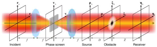 where denotes the transmittance function of the obstacle. In the last step, the obstructed beam propagates further to the receiver plane. It is expressed as: