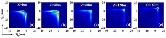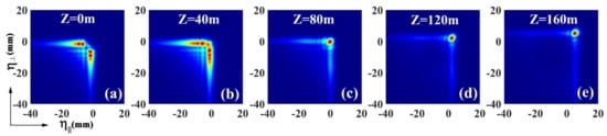 Density plots of the intensity distributions of a PCAB at the different propagation distances (a) Z = 0 m, (b) Z = 40 m, (c) Z = 80 m, (d) Z = 120 m, and (e) Z = 160 m during propagation. The beam is obstructed by an opaque obstacle in the source plane. The source coherence width is given by .