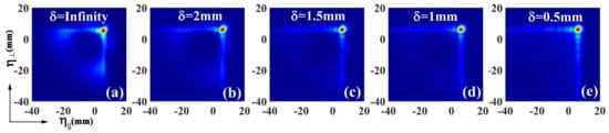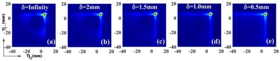 To visualize the entire process of the self-healing of PCABs, we show the intensity profiles of an obstructed beam at different distances during propagation. The results are shown in Figure 2, and the source coherence width is given by . Figure 2a shows that the main peak of the PCAB is blocked by an opaque obstacle. The energy of the side lobes of the beam gradually flows toward the main peak with increasing propagation distance, as shown in Figure 2b,c. When the beam propagates further, the Airy pattern recovers well, as shown in Figure 2d,f. To investigate the effect of the source coherence on the self-healing of PCABs, we display the intensity profiles of the obstructed beam with different coherence widths in the receiver plane Z = 160 m. It is worth noting that in the case of , shown in Figure 3a, the PCAB reduces to a conventional fully coherent Airy beam, as described in []. It is found that for the conventional fully coherent Airy beam, although the main peak recovers, the side lobes are deformed (there is a large dark area near the main peak). It is evident that, as the source coherence decreases, the main peak and side lobes gradually recover. Hence, we can infer that the self-healing ability of PCABs is better than that of conventional fully coherent Airy beams, and it is improved by decreasing the source coherence.