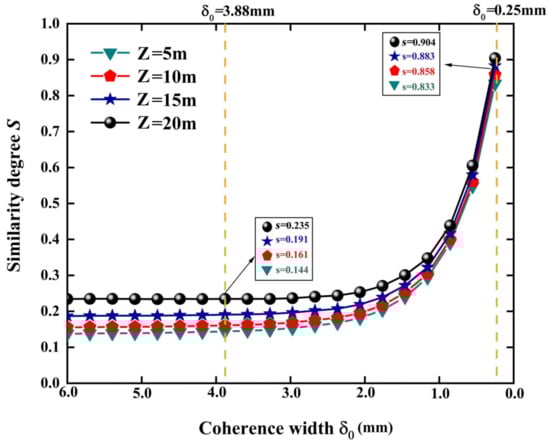 To quantitatively describe the self-healing ability of a PCAB, we use the similarity degree, defined by Equation (6), to investigate the effect of the source coherence and propagation distance Z on the self-healing property of the beam. We plot the similarity degree as a function of the coherence width for different distances. The results are shown in Figure 4. The different colors, explained in the top-left corner, denote different propagation distances. As the source coherence deteriorates ( decreases from left to right in the plots), the similarity degree S increases, which implies that the obstructed PCAB gradually recovers. In particular, after , the similarity degree S increases rapidly, and reaches 0.904 when for the Z = 20 m curve. As described by coherence theory [], if the coherence area is much larger than the beam spot area (), the partially coherent beam can be treated as a fully coherent beam. Hence, for , the similarity degree S value remains almost invariant at approximately 0.235. The similarity degree S ranges from 0.235 to 0.904 when we reduce the source coherence of a (quasi-) fully coherent Airy beam to that of a low-coherence Airy beam. This proves that the self-healing ability of the PCAB is effectively improved as the source coherence decreases, and that such a PCAB has a much better self-healing ability than the conventional fully coherent Airy beam. Furthermore, as shown by the left straight line (at ) and annotation, the similarity degree S ranges from 0.144 to 0.235 when the propagation distance varies from Z = 5 to 20 m. This demonstrates that the self-healing ability of the beams increases with the propagation distance. This is also achieved in [].