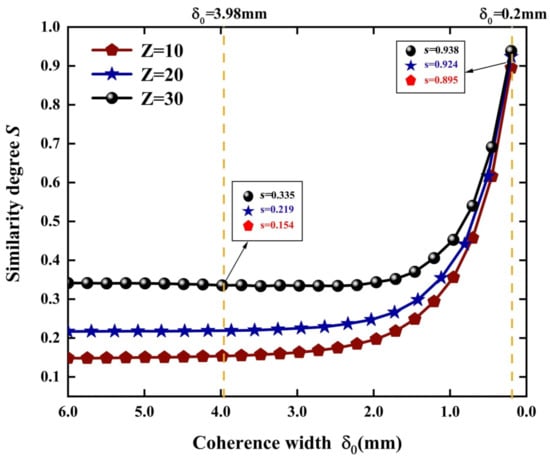 Finally, we quantitatively describe the self-healing ability of the PCAB obstructed by an opaque obstacle at D = 10 m. The similarity degree curves are plotted in Figure 7 as a function of the coherence width for different propagation distances Z. Each curve illustrates that the self-healing ability of the beam increases as the source coherence decreases. Taking the Z = 10 m case as an example, the (quasi-) fully coherent Airy beam has a similarity degree of S = 0.154, and the low-coherence Airy beam with has a similarity degree of S = 0.895. The self-healing ability of such a PCAB is significantly larger than that of the conventional fully coherent Airy beam, even with an obstacle in the propagation path. Likewise, for a fixed source coherence, the self-healing ability of the beam can be further enhanced with the propagation distance.