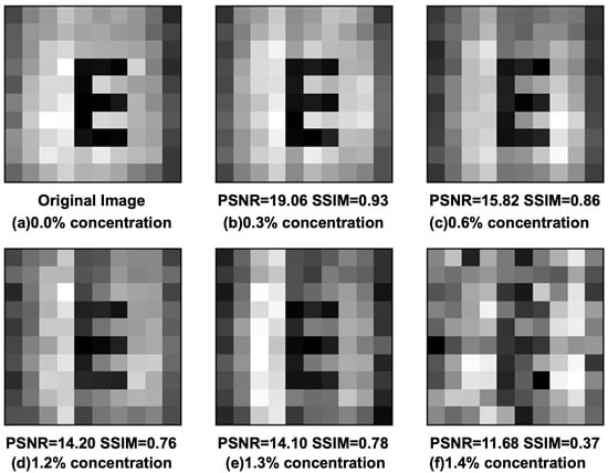 The PSNR is used to evaluate Figure 5 using the same way as before, and the values of (b), (c), (d), (e), and (f) were obtained as 19.06, 15.82, 14.20, 14.10, and 11.68, respectively. The SSIM values are 0.93, 0.86, 0.76, 0.78, and 0.37, respectively. The values of PSNR can be used to distinguish the concentrations for the same number of measurements at different concentrations. However, SSIM has a more obvious distinction. For the values of SSIM higher than 0.70, the letter “E” can be identified. When (e) comparing (f) in Figure 5, the value of PSNR has only a small decrease in the unidentifiable image, but SSIM has a large decrease. The PSNR values are 14.10 and 11.68, which is only a 10% change, even for the good quality image of PSNR value 30, while the SSIM values are 0.78 and 0.37, with a difference of about 50%. For the same number of measurements, the results of the reconstructed target fraction deteriorate with increasing concentrations.