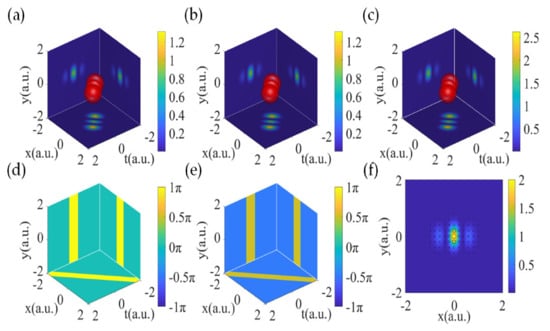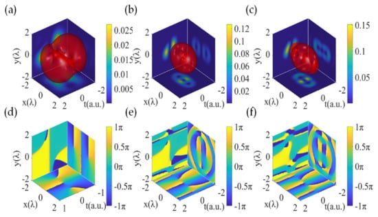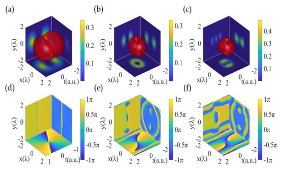 To investigate the effect of the incident spatial waist radius on the OAM in the z-polarized component of the focused wave packet, we also set to be 0.3, 0.5, and 0.7 and calculated the three-dimensional spatiotemporal distribution of the z-polarized component of the focal field in each case. The results are shown in Figure 6, from which we can see the OAM in the z-polarized component exhibited a more complex spatiotemporal structure. According to the intensity distribution in the y–t plane shown in Figure 6a–c, there existed a phase singularity trace in the center of the wave packet in each case, and the phase singularity trace was tilted as the incident spatial waist radius increased. Correspondingly, there exists an abrupt phase variation line in the y–t plane, as shown in Figure 6d–f. Assuming the central wavelength of the wave packet was 1 μm and the pulse half-width was 10 fs, the tilt angles of the phase singularity trace in the three cases were evaluated to be 0°, 7.43°, and 40.03°, indicating that an increase in significantly affected the tilt angle of the phase singularity trace in the z-polarized component.