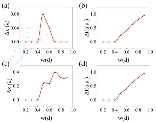 To further analyze the variation rule of the focused STOVs in the transversely polarized components caused by the incident spatial waist radius, was changed from 0.2 to 0.9 with ste of 0.1. The spacing between the focused STOVs was calculated in each case and the results are shown in Figure 5. Figure 5a,b presents the spacing variation between the STOVs in the x-polarized component of the focused field along the x-axis and t-axis, respectively. Meanwhile, Figure 5c,d gives the spacing variation in the y-polarized component of the focused field along the x-axis and t-axis, respectively. We can see that when was less than 0.4, the spacing along the x-axis and t-axis was 0 for both the x-polarized component and y-polarized component, indicating the second-order STOV did not split. When was larger than 0.4, the second-order STOV split into two first-order STOVs for both the x- and y-polarized components, and the spacing between the two first-order STOVs along the t-axis almost linearly increased as increased. The spatial waist of the incident wave packet had less of an effect on the spacing along the x-axis for the x-polarized component compared to that of the y-polarized component. It should be pointed out that the incident spatial waist radius was normalized by the pupil radius of the high NA lens; thus, the horizontal axes in Figure 5a–d represent the ratio between the spatial waist radius of the incident wave packet and the pupil radius of the high NA lens.