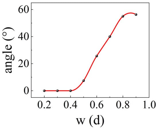 To reveal the relationship between the tilt angle of the phase singularity trace in the z-polarized component and the incident spatial waist radius , we changed in the range [0.2, 0.9] with step of 0.1 and calculated the tilt angle in each case. The results are shown in Figure 7. Obviously, when the incident spatial waist was less than 0.4, the tilt angle was kept as 0°, indicating that transverse OAM was predominant in that case. When the incident spatial waist was larger than 0.4, the tilt angle increased almost linearly as increased. Thus, the tilt angle of the phase singularity trace in the z-polarized component of the focal field could be controlled by just changing the spatial waist radius of the incident wave packet.