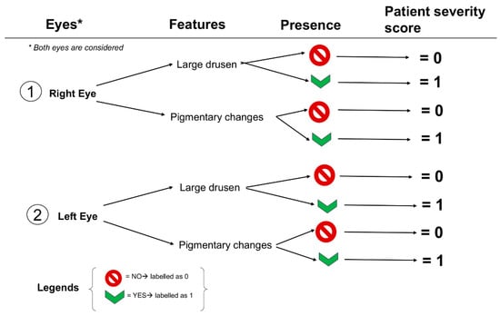 - Ferris, F.L.; Davis, M.D.; Clemons, T.E.; Lee, L.Y.; Chew, E.Y.; Lindblad, A.S.; Milton, R.C.; Bressler, S.B.; Klein, R. A simplified severity scale for age-related macular degeneration: AREDS Report No. 18. Arch Ophthalmol. 2005, 123, 1570–1574. [Google Scholar] [CrossRef]