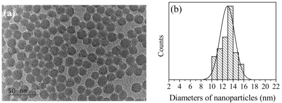 The first step of our investigation was the characterization of the shape, size and structure of the nanoparticles. Figure 1 shows a TEM image of SiO2 nanoparticles and their size distribution. The particles had a spherical shape, quite uniform distribution and average size of 13 nm. The particles were well separated from each other and no aggregation was observed. Selected area electron diffraction (SAED) (not shown in Figure 1) proved the amorphous status of the silica particles.