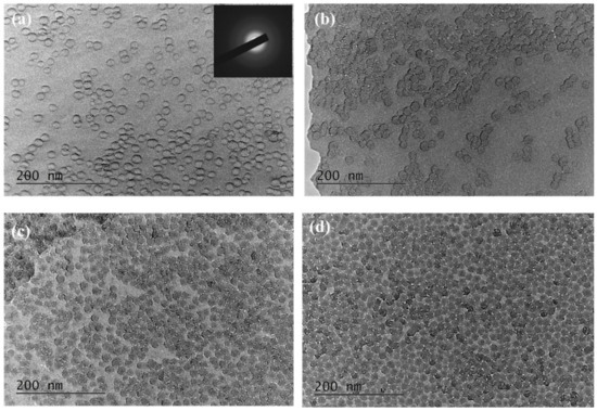From the images in Figure 2 it can be seen that increasing the amount of nanoparticles in the sol increases the volume fraction of the particles inside the Nb2O5 film. In all four cases under investigation, the particles were distributed evenly over the entire surface of the films, and no aggregated clusters were observed. The SAED patterns were taken of each film, but for the sake of brevity only for the first one is shown. They confirm the amorphous nature of the films. The comparison of Figure 1 and Figure 2 shows that after the films annealing, SiO2 nanoparticles inside the composite films preserve their size and shape. This was expected, considering that SiO2 nanoparticles are temperature-stable and durable.