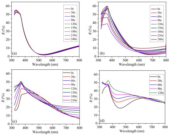 It can be seen from the figure that when the Nb2O5 phase prevailed (ratio 50:1, Figure 4a), etching took place at a very slow rate—the change in the reflectance spectra due to etching up to 240 s is very weak. On the contrary, when the SiO2 phase prevailed (ratio 5:1, Figure 4d) the etching was much more effective—a substantial change in the reflectance spectrum is seen at each etching step. Spectra of 10:1 and 20:1 samples changed continuously during etching.
