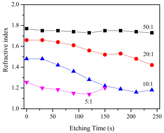 Figure 5 demonstrates a continuous decrease in the refractive index with etching time for all studied films. However, the reduction rate of n is different and depends on the initial chemical composition of the films. The strongest change in refractive index was observed for films with sol to template ratios of 20:1 and 10:1. It is interesting to note that at up to 240 s for the first film and up to 210 s for the second there was no thickness change (Table 1). For 50:1 films where Nb2O5 prevailed, the change in the refractive index was very weak and no thickness change was observed for etching up to 240 s. On the contrary, for films with a predominant SiO2 phase, in addition to a decrease in the refractive index a monotonous decrease in thickness took place that continued up to 120 s, and thickness changed from 266 nm to 220 nm. A further 30 s etching led to a strong dissolution of the films as indicated by a sharp decrease in the thickness from 220 nm to 100 nm.