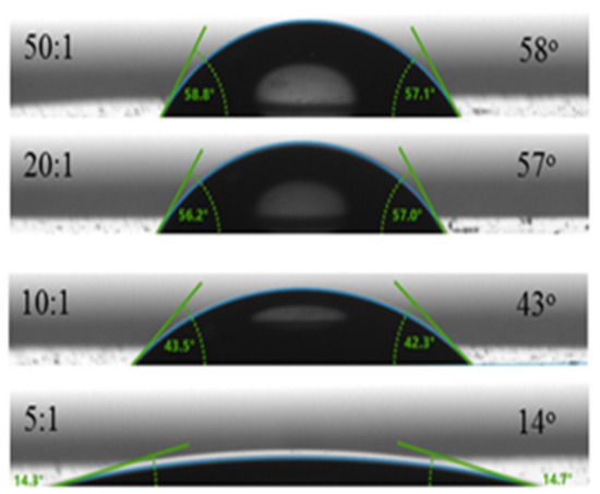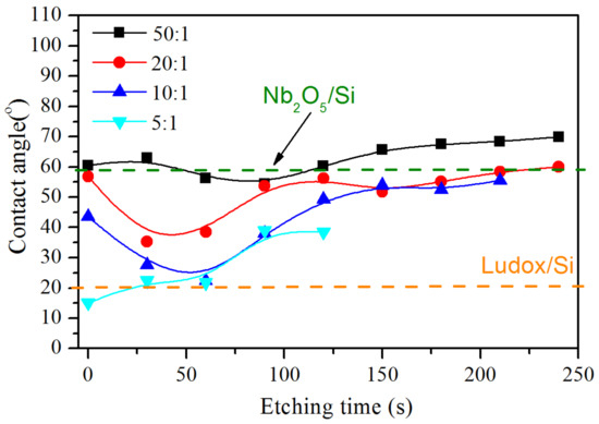 In the first step, the water contact angles of the films were measured before etching and the results are presented in Figure 6. It is seen that as the SiO2 phase increased, the contact angle decreased from 58° at a sol to template ratio of 50:1 to 14° at 5:1. The measured contact angles of Nb2O5 and SiO2 layers are 59° and 20°, respectively, which confirms the assumption that Nb2O5 is much more hydrophobic than SiO2. Therefore, when the hydrophilic phase of SiO2 was added to the hydrophobic Nb2O5, the resulting effective medium became more hydrophilic, i.e., the contact angle decreased.