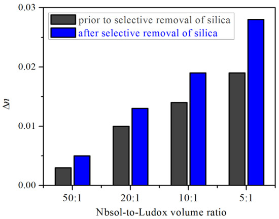 The final step of our investigation concerned the sensing behavior of the studied films. Our previous sensing experiments have shown that pure sol-gel Nb2O5 films do not change their refractive index when exposed to vapors of volatile organic compounds. If we assume that silica nanoparticles in the studied hard-templated Nb2O5 films are tightly surrounded by the niobia matrix and there are no free spaces inside the films, it could be expected that films do not change their refractive index when exposed to vapors. However, measurements have demonstrated a change in refractive index of the films before removal of silica that increased with nanoparticle content in the films (Figure 8). These observations are in line with the results of calculated volume fractions of air in the films that confirm the increase in free volume with the addition of colloidal nanoparticles.