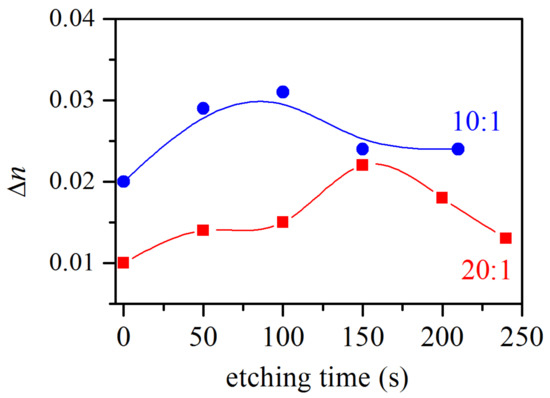 In order to optimize the sensor response further, the etching duration was varied in the range from 0 to 210 s for the 10:1 sample and from 0 to 240 s for the 20:1 sample. Reflectance spectra were measured in an ambient of argon and acetone vapors, and the change in refractive index Δn was calculated from the reflectance change. The results are presented in Figure 9. It is seen from Figure 9 that for both samples there is an optimal etching duration that leads to maximal refractive index change and it depends on the initial amount of silica in the films. When this amount is less (sample 20:1), the optimum value is around 150 s and shifts to 100 s with increasing amount of SiO2 phase in the composite films (10:1 sample). If we look again at the results in Table 1 we see that the best sensing performance of both films is for etching durations that allow small amounts of silica to remain in the films.