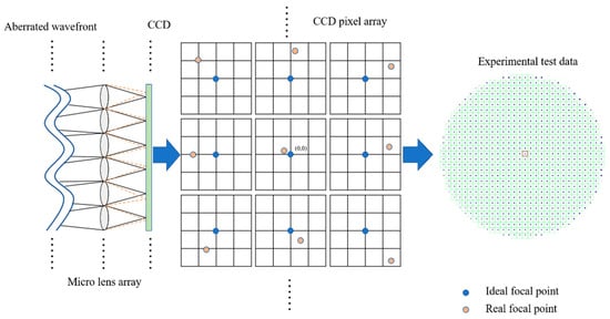 To detect the overall distortions, the Shack–Hartmann wavefront detector, composed of a micro lens array and a charge-coupled device (CCD), is adopted to measure the aberrated wavefront first in this work. As shown in Figure 3, the array of micro lenses with equal focal length act as sub-apertures with the same size to divide the wavefront to be detected into an array of discrete sub-wavefronts. Each sub-aperture or sub-wavefront corresponds to a pixel of CCD located at the focal plane, with the micro lens array and the CCD image plane fixed in position. After light propagation through the micro lens array, the incident wavefront is spatially divided and collected by such sub-apertures to form an array of dots in its focal plane, as shown in Figure 3. By scanning the imaging plane with the Shack–Hartmann sensor, the actual image point positions of multiple field points are found, and the distortion of all the actual image points in the x- and y-directions in the coordinate system of the Shack–Hartmann sensor is compared with the coordinates of the stage to obtain the distortion of all the actual image points in the x- and y-directions from the ideal image point positions. The distortion of all the field points in the x- and y-directions are substituted into Equation (4) to obtain the distortion parameters.