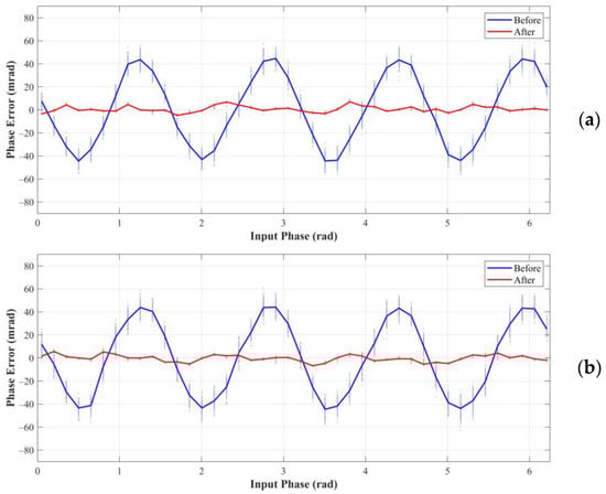 It can be inferred from Figure 5b, Equation (15), and Equation (18) that the wiggling errors of the two measurements are exactly opposite. Therefore, we add the measured phases of the two measurements to cancel the wiggling error and get the phase shift :