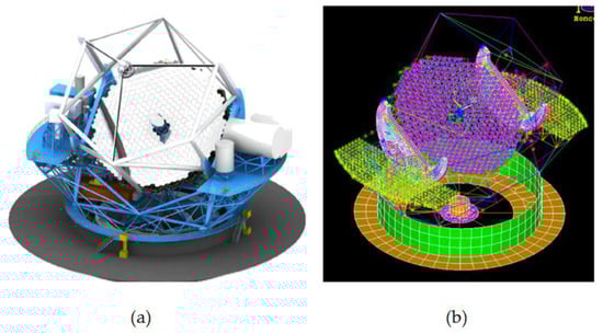 For ground-based telescopes, ambient temperature changes and axial temperature gradient changes caused by direct sunlight are two key thermal factors. The Nanjing Institute of Astronomical Optics and Technology (NIAOT) evaluated the effect of ambient temperatures on the image quality of an astronomical telescope by IOA []. The linear interpolation technique derived from shape functions in the finite element theory was applied as an interface for the thermal model and structural model. Zernike polynomials and power series expansion were compared and used for fitting a paraboloid primary mirror with a diameter of 900 mm. Concurrently, Cho et al. [] performed thermal analyses for the Thirty Meter Telescope’s (TMT) structure. The telescope structural parts were modeled for various thermal conditions, including air convections, conduction, heat flux loadings, and radiation. The thermal responses of the TMT’s structure were successfully predicted for daytime and nighttime periods. The CAD model of the telescope’s structure and finite element model at a Zenith angle of 30 degrees are shown in Figure 2. Deep space solar observatories need to observe the local sun, and its main mirror should not only adapt to the temperature difference between day and night periods but also avoid the influence of heat sources on the axis with respect to optical performances. In response to this complex thermal environment, Li et al. [] used parabolic polynomials and Zernike polynomials to fit the thermal deformation of the main mirror under the supported conditions. According to the thermal analysis, the supporting system of the main reflector was improved by using a six-point support, which increased the thermal control accuracies.