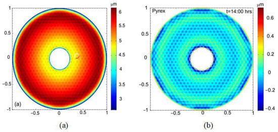 (a) Surface sag for a thermally deformed Pyrex mirror; (b) residual map [].